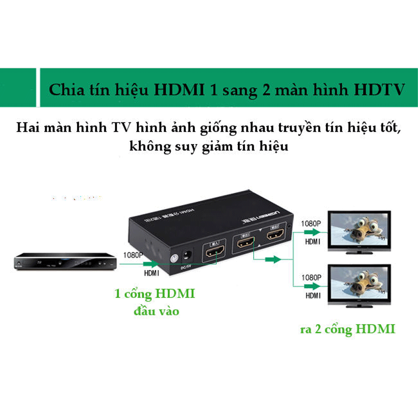 - Tính năng: kết nối truyền tải tín hiểu HDMI từ 1 thiết bị phát ra 2 màn hình cùng lúc