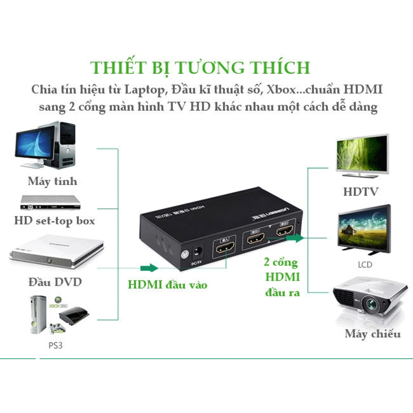 - Bộ chia HDMI 1 ra 2 Ugreen với chức năng khuếch đại loạt splitter HDMI giúp bạn truyền tải hình ảnh từ khoảng cách xa .